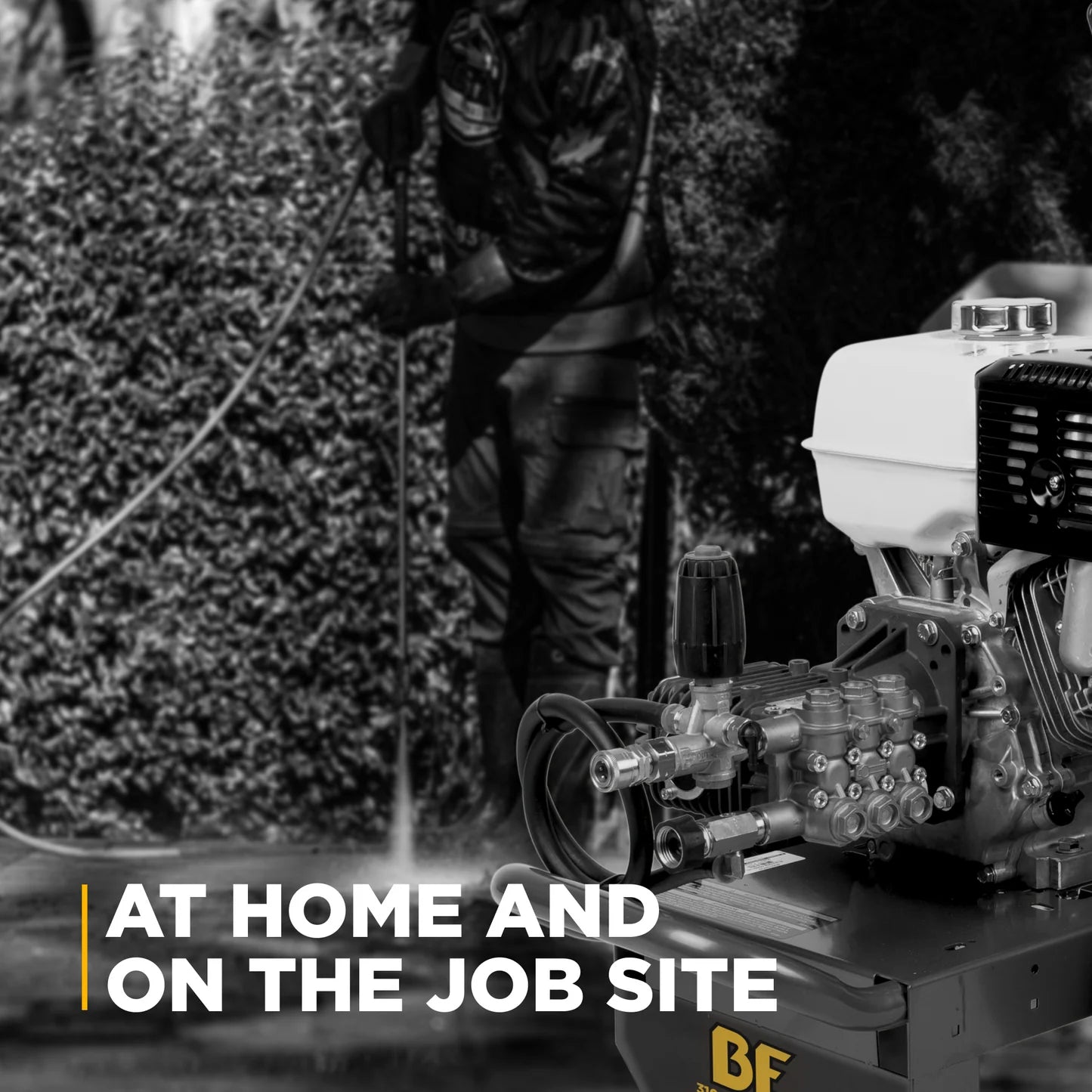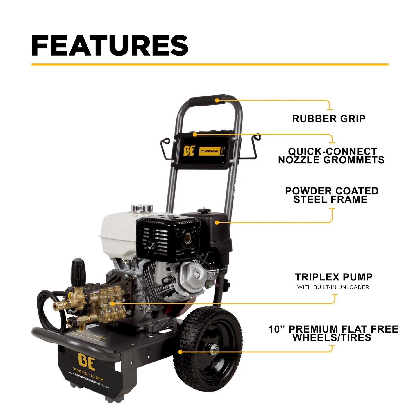 This BE Power Equipment Pressure Washer is a 3200PSI / 5.2 GPM commercial use pressure washer. With its durable powder coated frame, 12” flat free tires and easy tilt back design, this machine will tackle any of your hard to clean surfaces, stains and grime.