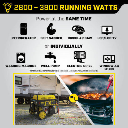 At 4375 starting watts and 3500 running watts, enjoy up to 12 hours of run time on a full tank of gasoline with a noise level of 68 dBA from 23 feet