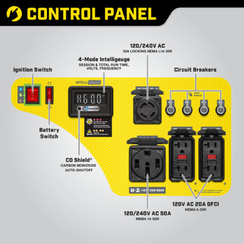 Two 120V 20A GFCI household duplex outlets, a 120/240V 30A locking outlet and a 120/240V 50A outlet, plus Volt Guard™ built-in surge protector prevents overloads and keeps your equipment safe