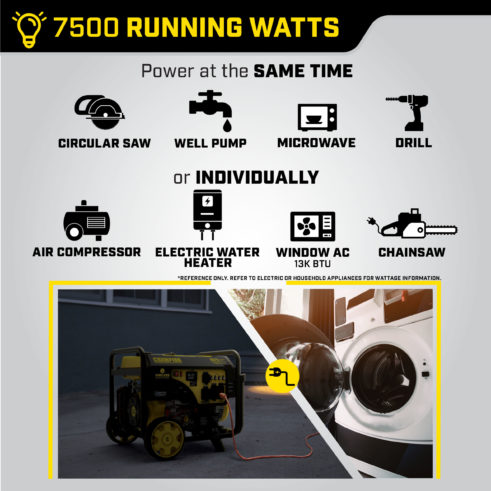 At 9375 starting watts and 7500 running watts, enjoy up to 8 hours of run time on a full tank of gasoline with a noise level of 74 dBA from 23 feet