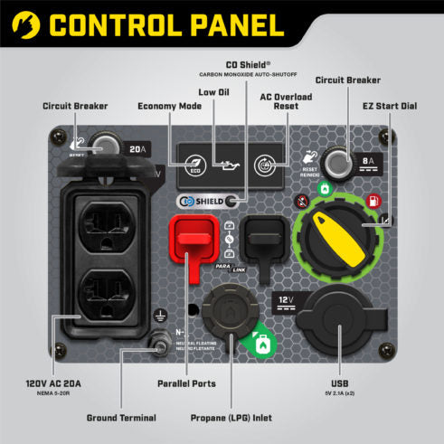 Operate your 2500-watt portable generator right out of the box on either gasoline or propane, plus features CO Shield® carbon monoxide auto shutoff system