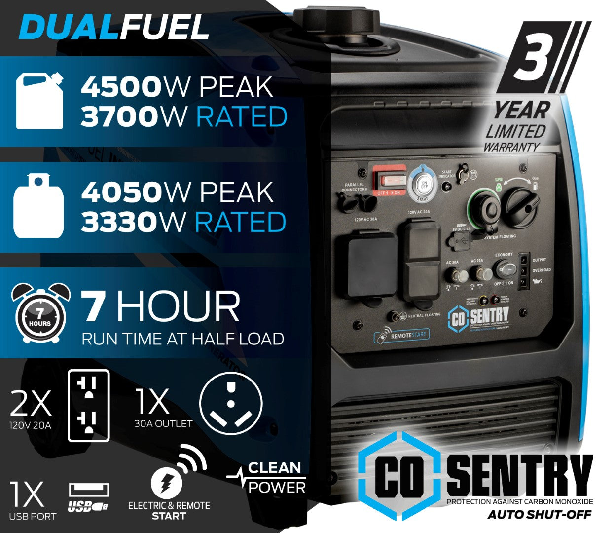 Pulsar PG4500BISRCO 4,500-Watt Remote Start Dual-Fuel Inverter Generator with CO Shutdown Sensor - PowerGen USA