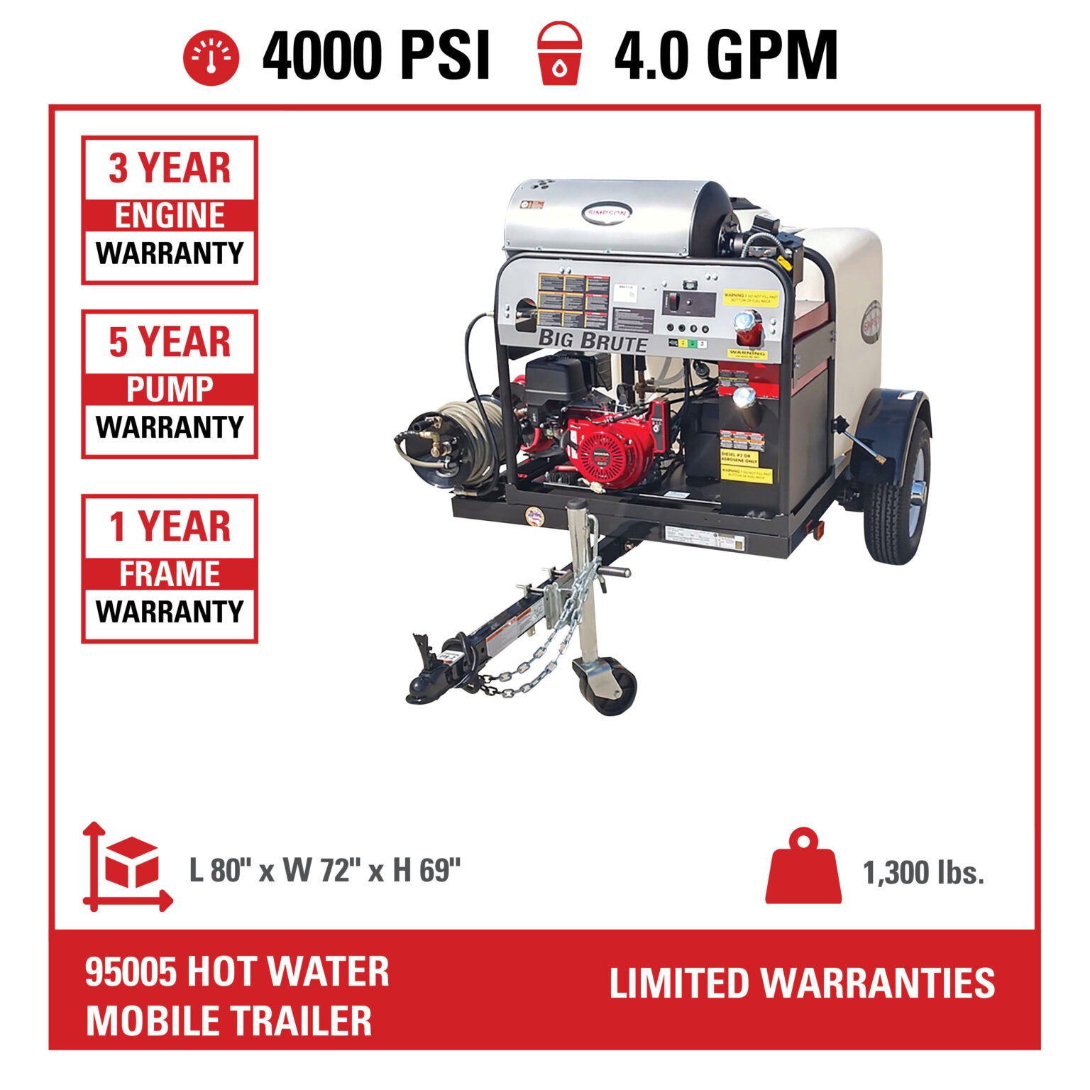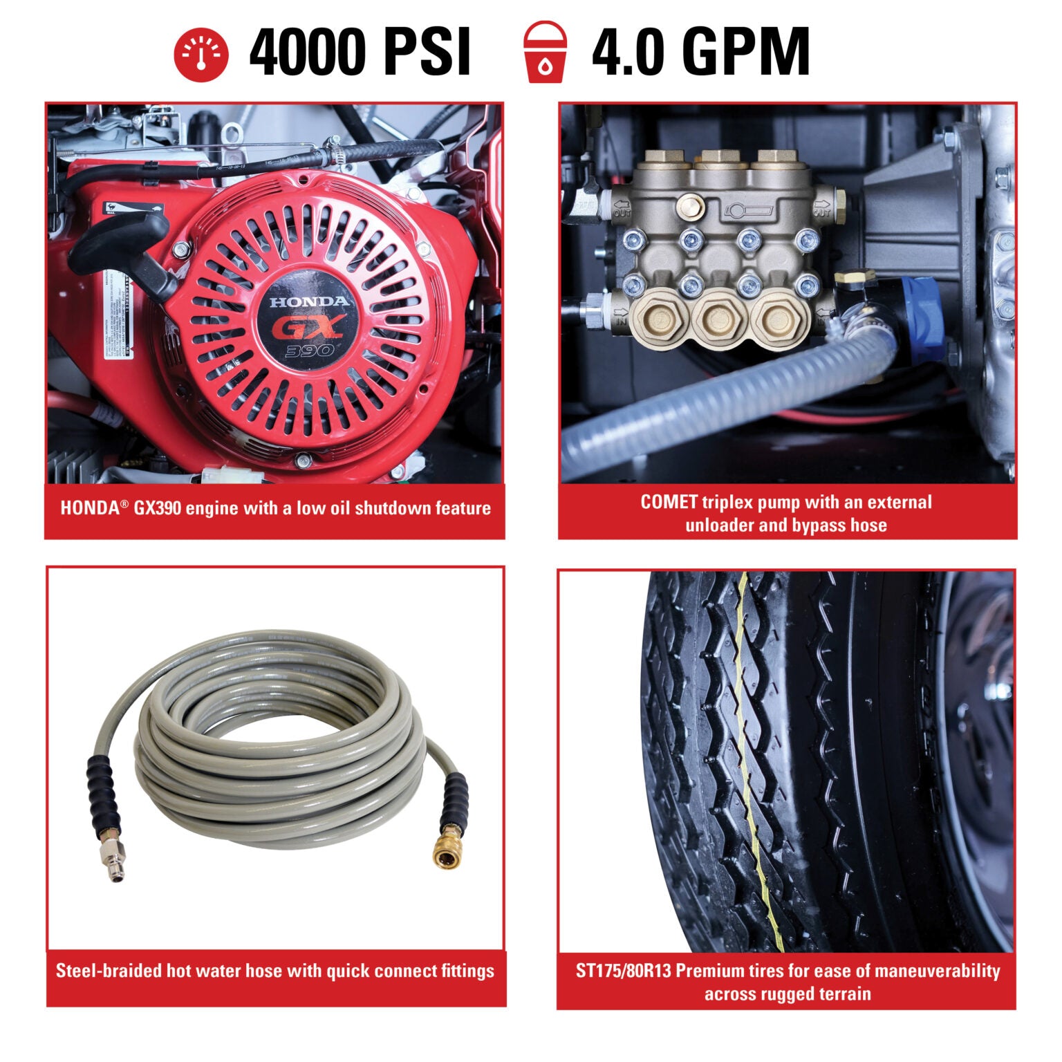 SIMPSON Mobile Trailer 95005 4000 PSI at 4.0 GPM HONDA® GX390 with COMET Triplex Plunger Pump Hot Water Professional Gas Pressure Washer Trailer- PowerGen USA