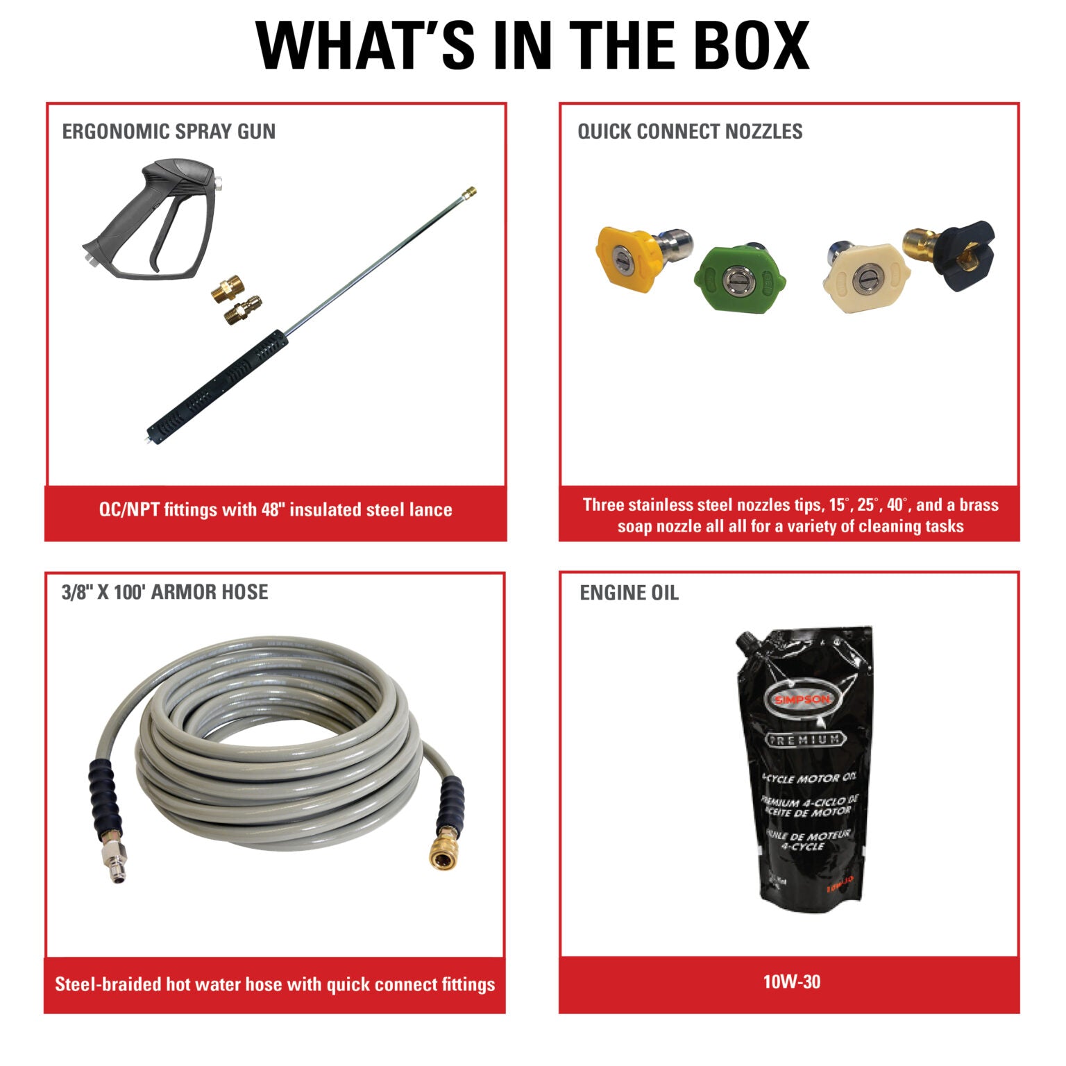 - 4 Quick connect nozzle tips, 15°, 25°, 40° and soap nozzle to use for a variety of cleaning applications