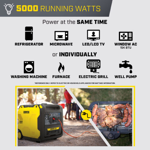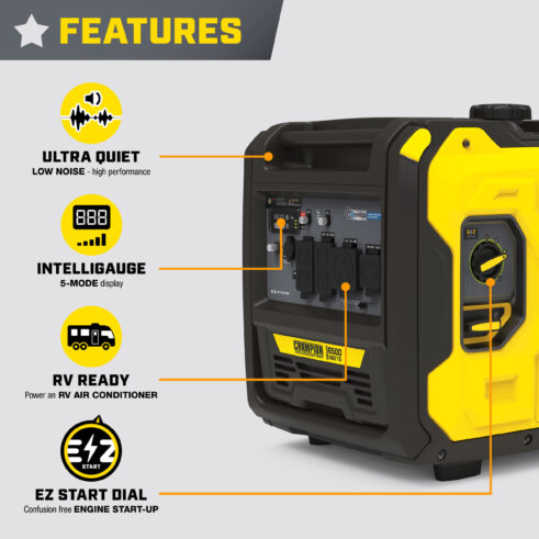 Champion’s EZ Start Dial makes getting started quick and easy. Featuring Cold Start Technology, Extended Run Time, and an easy to read fuel gauge, the reliable 223cc Champion engine produces 6500 starting watts and 5000 running watts, and runs for 15 hours at 25% load when the 3.95-gallon fuel tank is full.