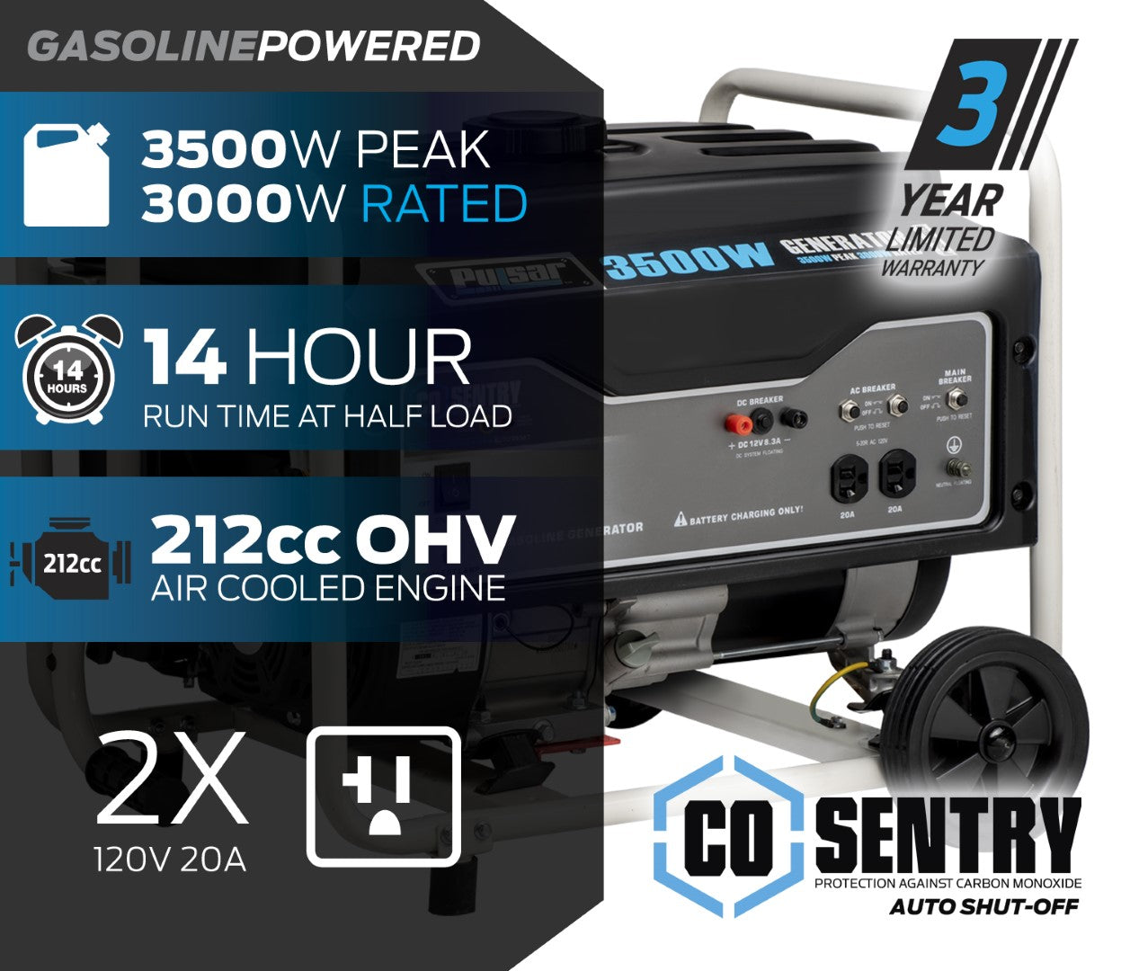 Pulsar PG3500MRCO 3,500-Watt Gasoline Powered Generator with CO Shutdown Sensor and Mobility Kit - PowerGen USA