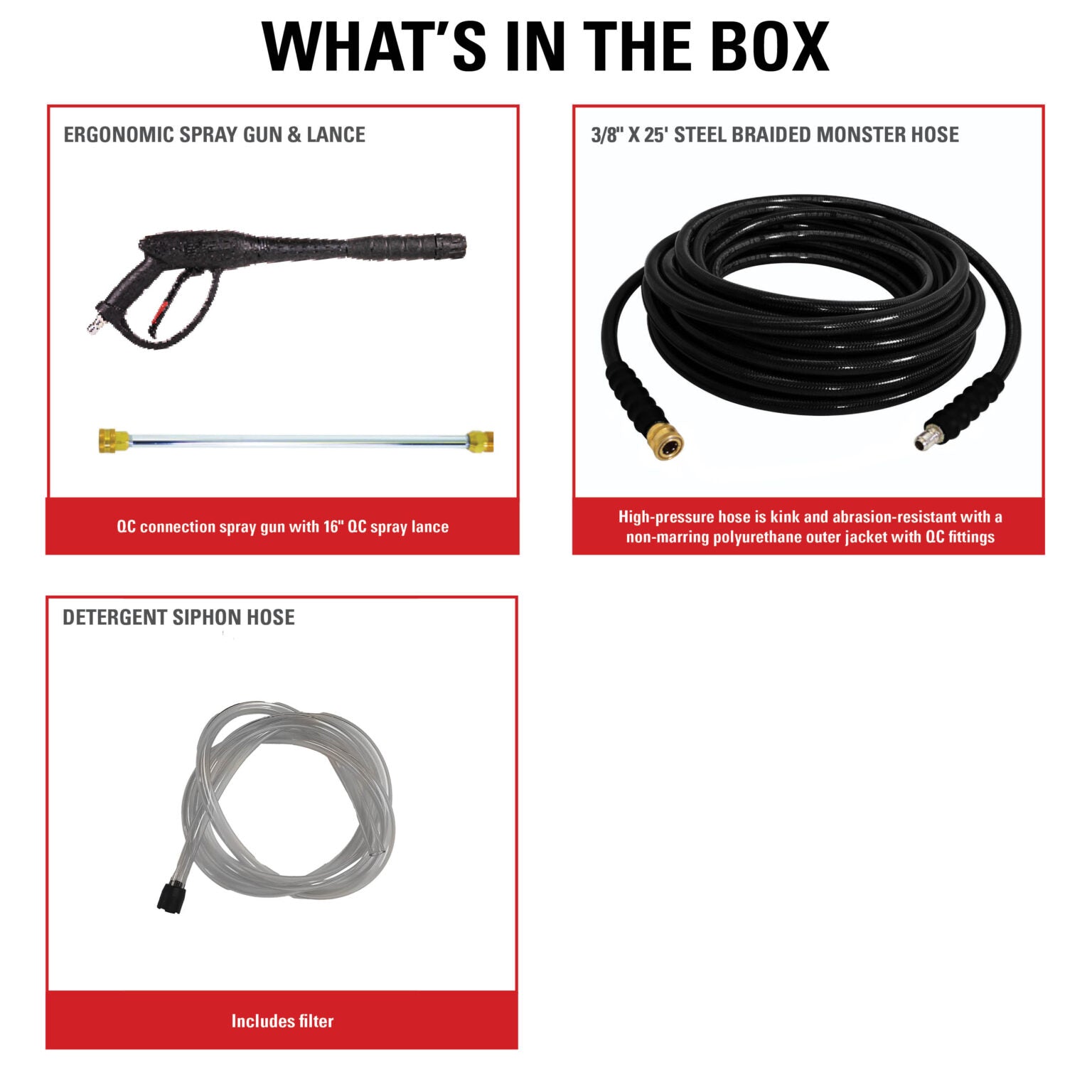 - Hose: Steel-braided Monster Hose 3/8 in. x 25 ft.