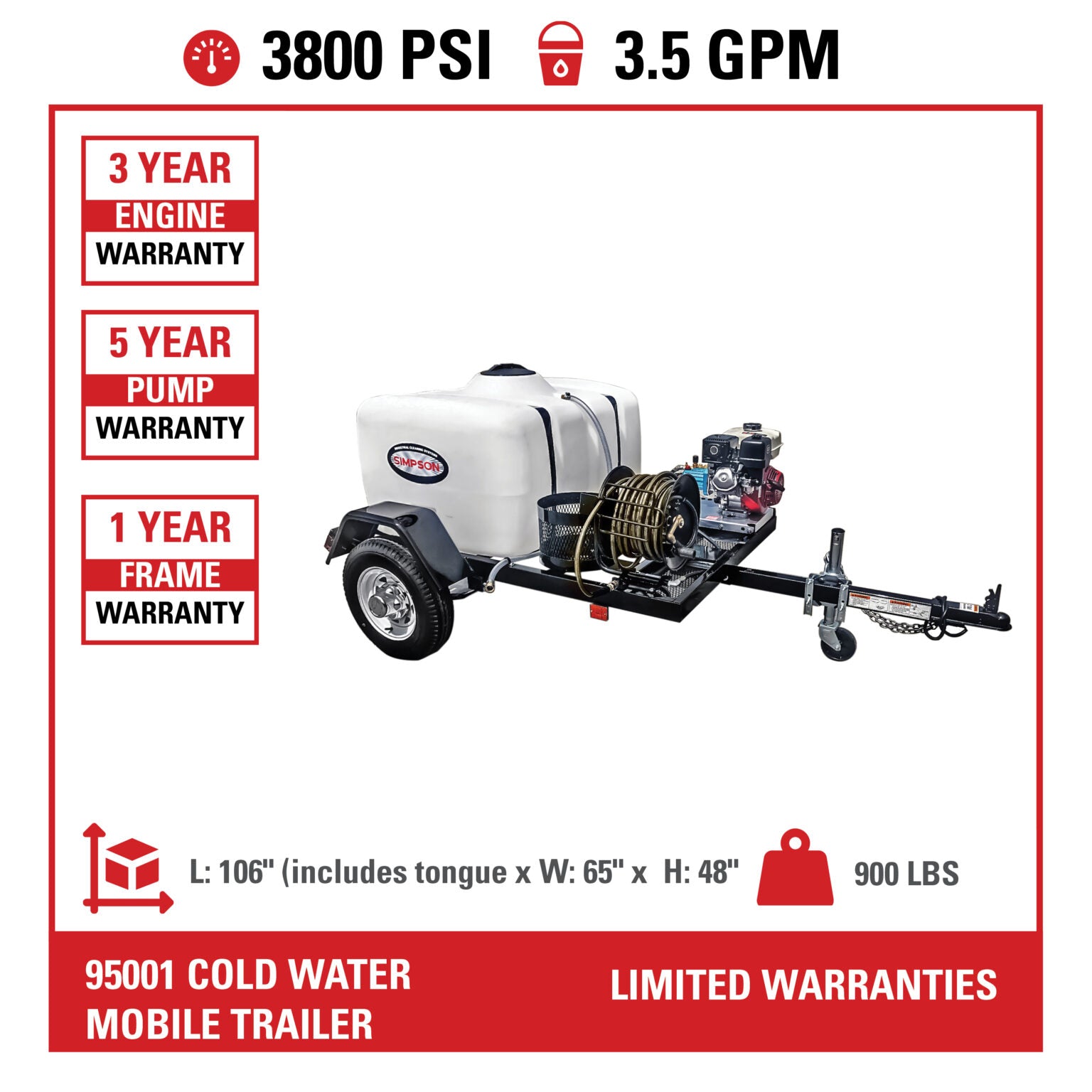 SIMPSON Mobile Trailer 95001 3800 PSI at 3.5 GPM HONDA® GX270 with CAT® Triplex Plunger Pump Cold Water Professional Gas Pressure Washer Trailer- PowerGen USA